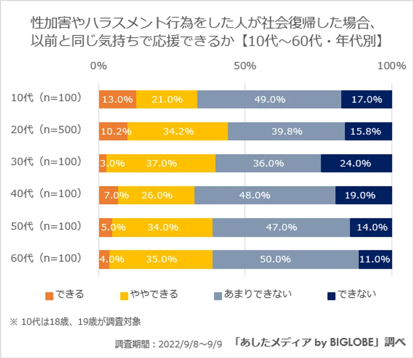 全国の10代(18歳、19歳)と20代の男女600人に「性加害やハラスメント行為をした人が社会復帰した場合、以前と同じ気持ちで応援できるか」と質問したところ、「できる」「ややできる」を合わせた回答は、42.7%と半数を割った。特に10代は34.0%と低い割合となった。