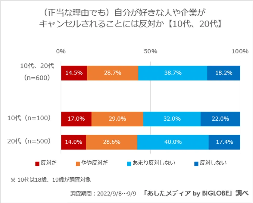 一方で、「(正当な理由でも)自分が好きな人や企業がキャンセルされることには反対か」という質問には「反対だ」「やや反対だ」をあわせた回答は、10代が46.0%、20代が42.6%という結果となった。