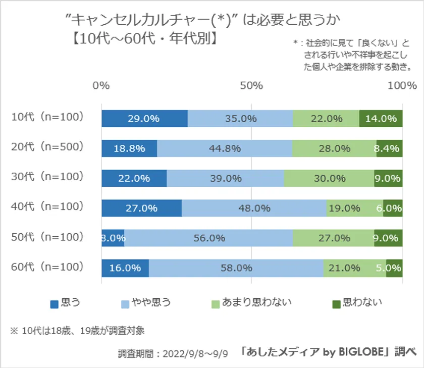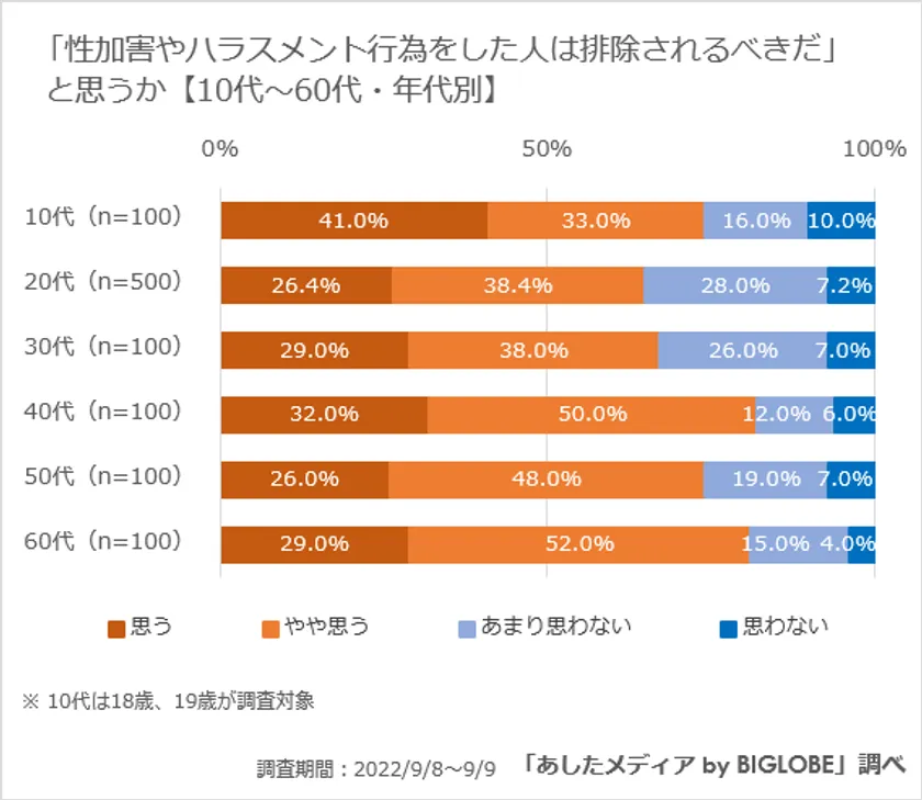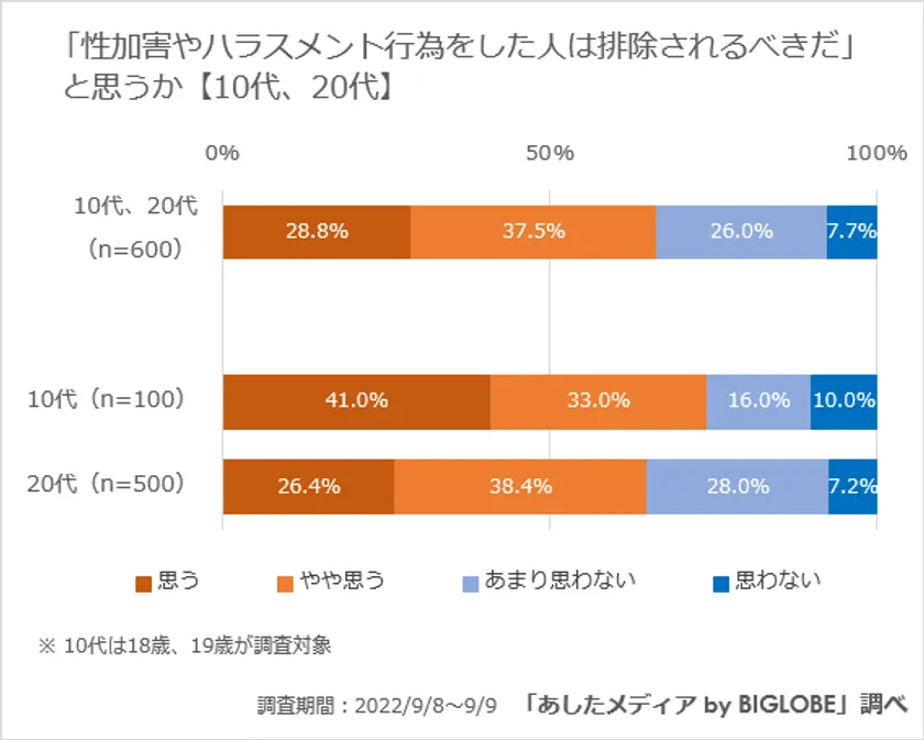 10代、20代「性加害やハラスメント行為をした人は 排除されるべき」7割弱 あしたメディア by BIGLOBEが 「若年層の意識調査」第2弾を発表 ~「キャンセルカルチャーは必要」6割、 「キャンセルのルール化が必要」7割~