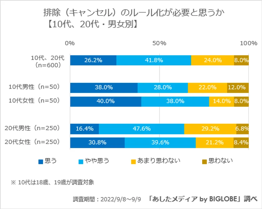 一方、「排除(キャンセル)のルール化が必要と思うか」という質問をしたところ、10代、20代の「思う」「やや思う」を合わた回答は68.0%となった。