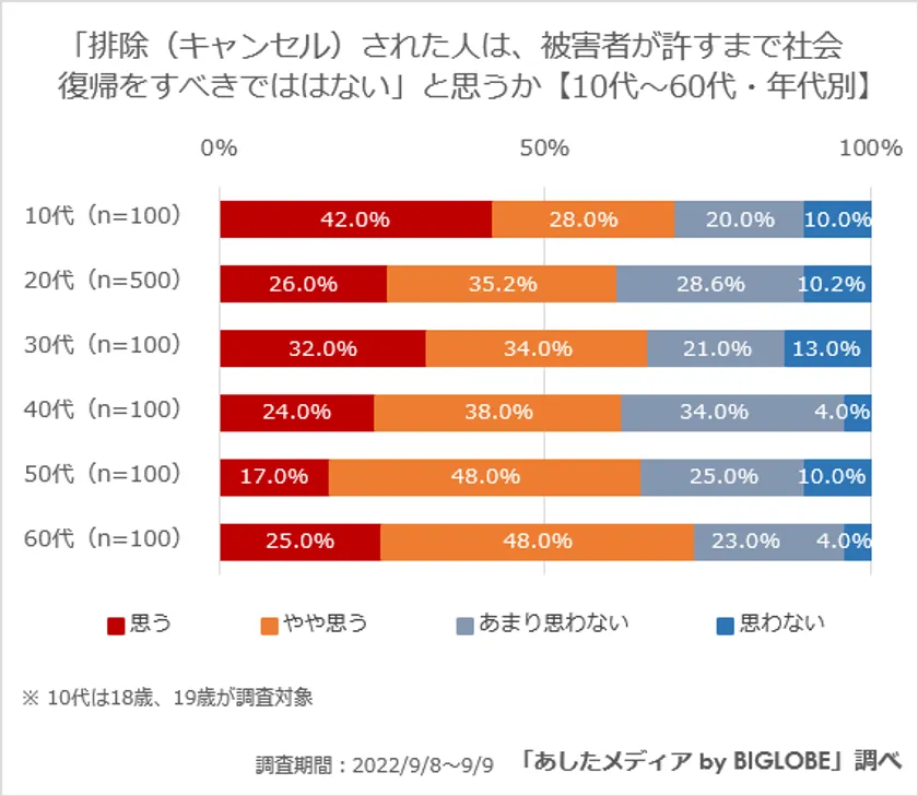 全国の10代(18歳、19歳)と20代の男女600人に「“排除(キャンセル)された人は、被害者が許すまで社会復帰をすべきではない”と思うか」と質問したところ、「思う」「やや思う」をあわせた回答は、62.7%となった。特に10代は「思う」「やや思う」をあわせた回答は70.0%と高い割合となった。