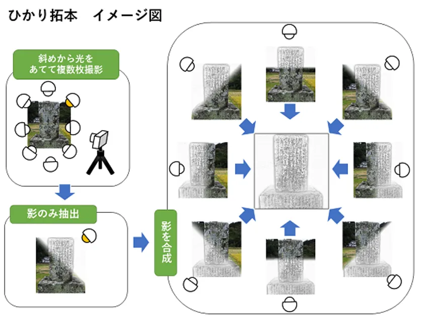 石碑の碑文などに対し、懐中電灯等で様々な角度より光を照射しながら撮影した複数の画像の影を合成し、普通に撮影した写真では読みにくい碑文の文字も判読できる技術です。石碑を汚すことなく拓本と同じ程度に簡単に碑文が読み取れる画像を作成することができます。