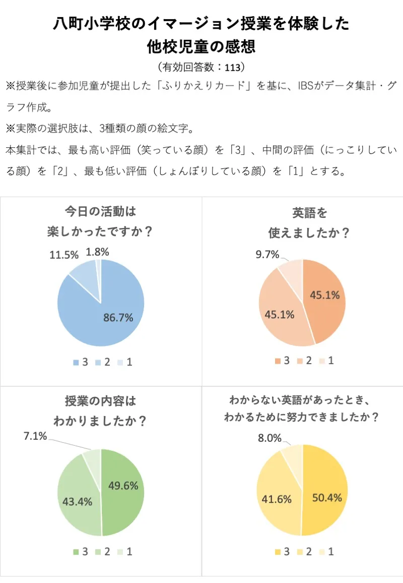 ●八町小学校のイマージョン授業を体験した他校の子どもたちは、指導の工夫によって英語と教科内容を理解でき、英語を使って何かを学ぶ授業を児童の86.7%が楽しいと感じ、英語への興味や学習意欲が高まった児童もいた。