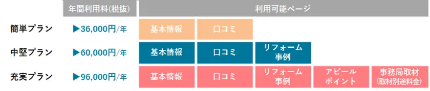 ・プランの違い:リフォーム評価ナビの事業者ページは5つのページで構成しており、プランによって利用できる事業者ページが異なります。詳細は下図を参照ください。
