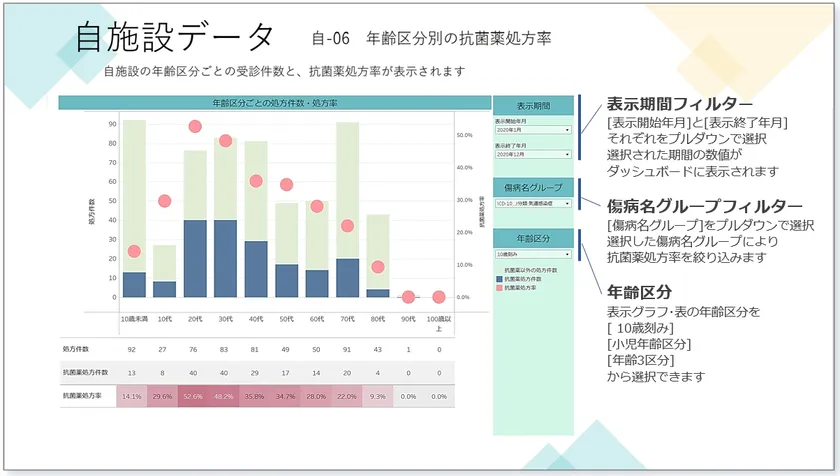 登録したレセプトデータに基づき、年齢別の受診件数、傷病名グループ別の抗菌薬処方率・内訳など詳細な分析結果を確認、処方内容の振り返りが可能です。