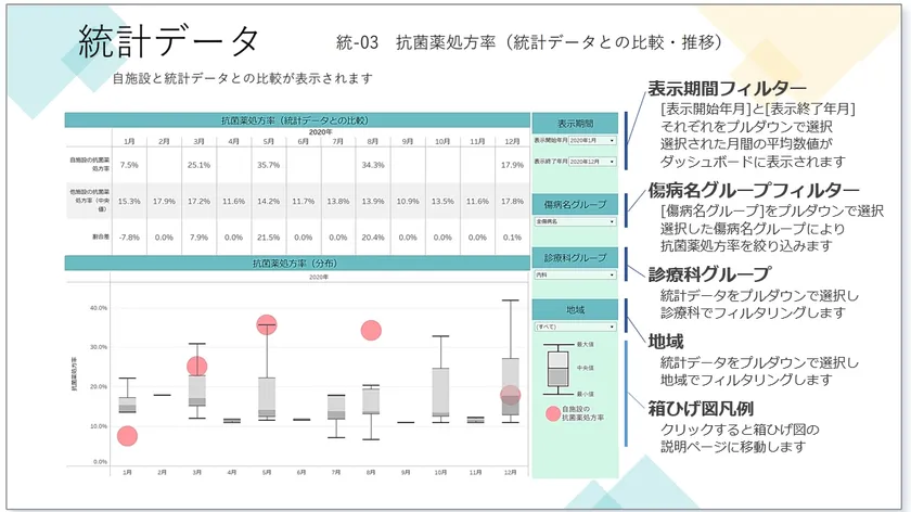すべての参加医療機関の登録データに基づき、抗菌薬処方の推移や地域の傾向がわかります。