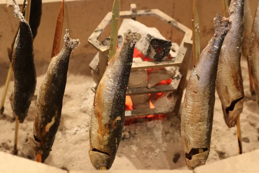 「大トロイワシ」は数千匹に一匹しか捕れないという脂がのった約30センチ、北海道から直送の真イワシです。半円型のカウンター前に設置した囲炉裏で30分かけてじっくり焼き上げます。