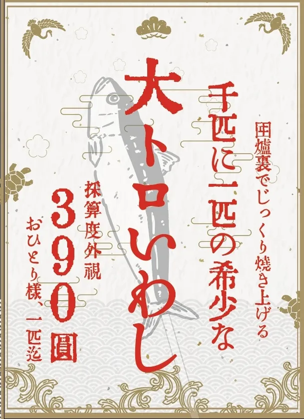 昨今、新型コロナウイルス感染症や戦争等の影響で外食産業において様々な環境が変化しています。グループでの来店頻度の低下、大皿料理の敬遠、原材料高騰など。今までならシェアして食べられる事が多かった大トロイワシも一人一匹気軽に召し上がれるよう、また食事需要のニーズにも応えれるよう採算度外視で提供することに至りました。自宅では難しい囲炉裏で焼いた大トロイワシを気軽に食べていただける店として認知していただいたり、外食の楽しさを体験していただければと思います。