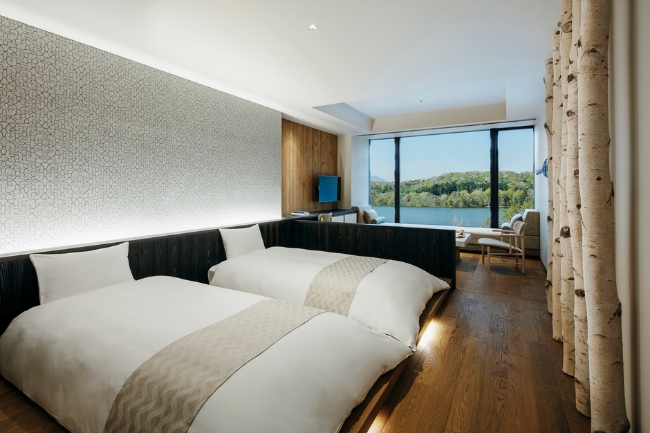ポロト湖に面した全客室は、アイヌ民族の暮らすチセ(*3)から着想を得てつくられました。全4タイプの客室すべてに、伝統的なチセの中心にあった四角い「炉(ろ)」をイメージしたテーブルを配します。宿泊者が炉を囲み、団欒して欲しいという思いを込めました。室内には、アイヌ民族の生活から着想を得た「木彫りのオール」などのアート作品を設え、壁紙やクッションには、アイヌ文様を施しました。アイヌ文化に触れることができる室内からは、眼前には穏やかなポロト湖と、白樺やカエデが繁る天然林が広がり、室内に設えられた白樺の丸太と相まって、雄大な自然に溶け込むような感覚に包まれます。