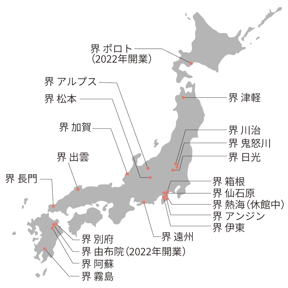 「界」は星野リゾートが全国に展開する温泉旅館ブランドです。「王道なのに、あたらしい。」をテーマに、季節の移ろいや和の趣、伝統を生かしながら現代のニーズに合わせたおもてなしを追求しています。また、その地域の伝統文化や工芸を体験する「ご当地楽(とうちがく)」や、地域の文化に触れる客室「ご当地部屋」が特徴です。現在、全国各地に展開しており、2021年7月に18施設目となる「界 別府」が大分県・別府温泉に開業しました。