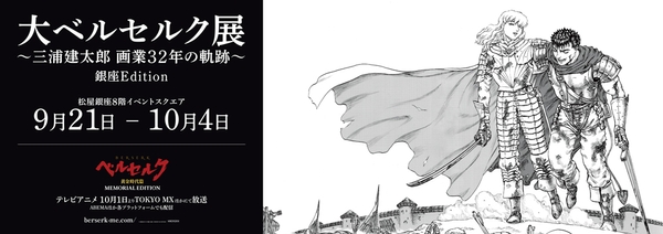 さらに9月21日(水)から開催中の『大ベルセルク展 ~三浦建太郎 画業32年の軌跡~ 銀座Edition』開催と、10月からのTVアニメ放送を記念して「小ベルセルク展」の開催が決定!9月26日(月)からのJR新宿駅構内での掲出をスタートに、12月まで三浦建太郎先生のイラストを全国数都市のターミナル駅等にて大型広告を掲出予定。この機会にぜひ大迫力の原作の原画をご覧ください。