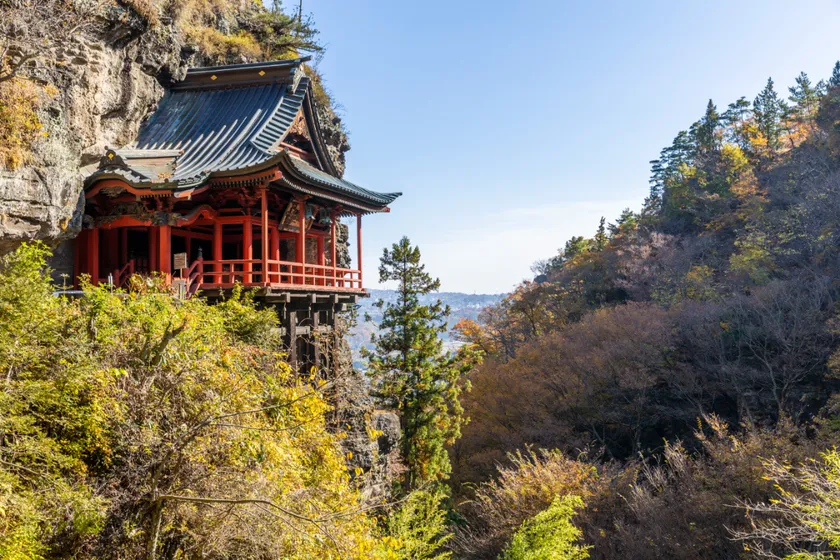「信濃耶馬溪」とも呼ばれる豪快な景観は、朱色の懸壁造の観音堂と紅葉の調和が大変美しいスポットです。「牛に引かれて善光寺参り」の布引伝説でも有名。
