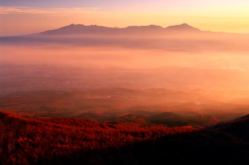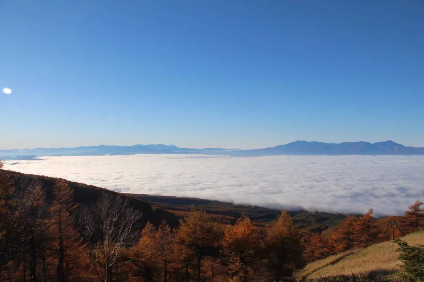標高約2,000mの雲上の世界へ。市街地から車を走らせること約30分。標高約2,000mの高峰高原は雲上の別世界。あたり一面が黄金色に染まるカラマツの黄葉が美しい絶景スポット。秋は雲海の発生率も高まり、朝方、高峰高原から町並みを見下ろすと、雲海が一面を覆い尽くす様は圧巻です。黄金色に色づくカラマツとの夕景もおすすめです。
