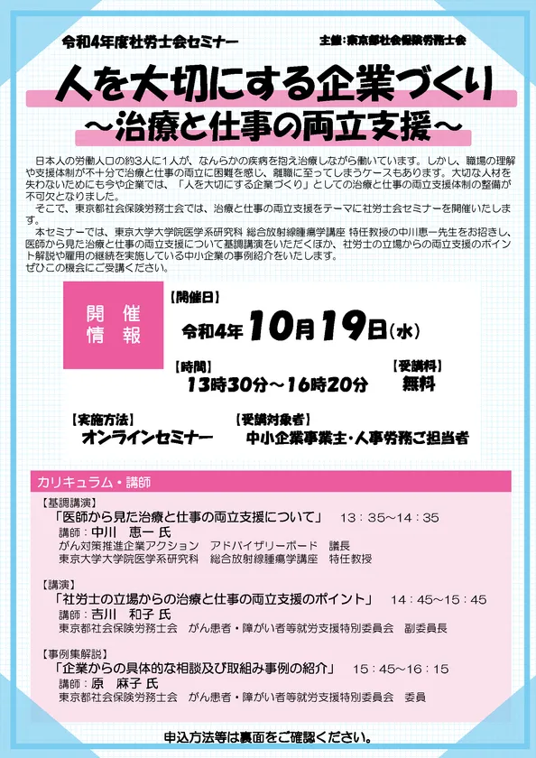 オンライン社労士会セミナー 「人を大切にする企業づくり~治療と仕事の両立支援~」 10月19日(水)に開催