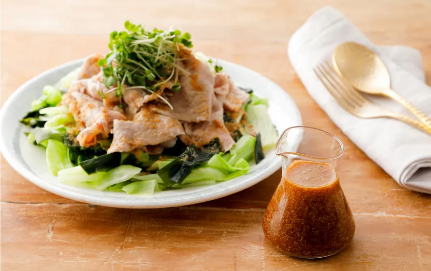 豚しゃぶサラダや、蒸し鶏におすすめ。無味無臭のMCTオイルだからこそ、ごまの健康成分摂取はもちろん、風味も引き立つので、ごま好きの人にはぜひ。