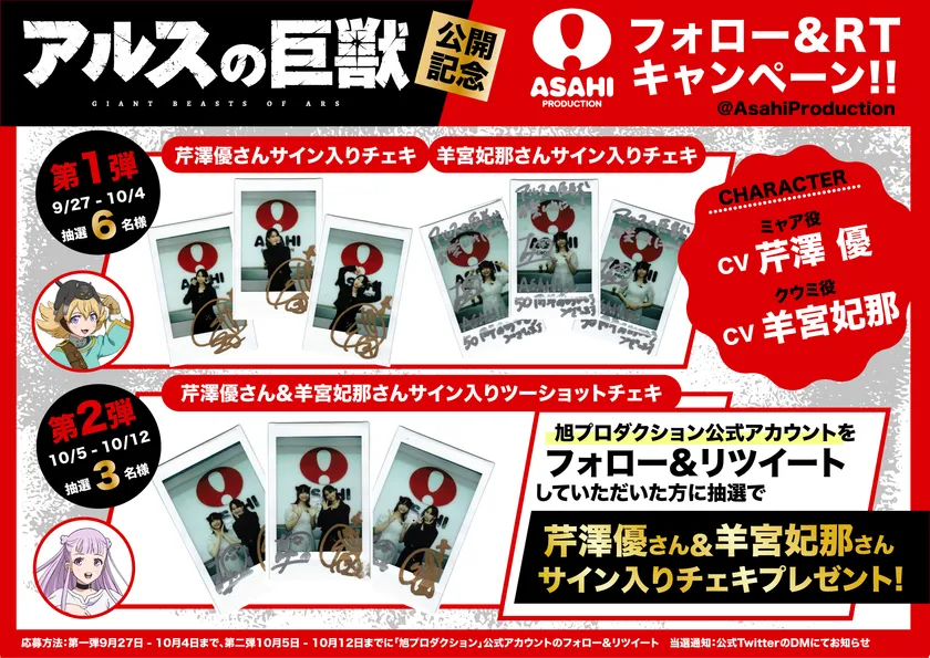 今回この『アルスの巨獣』の2023年1月のTVアニメ公開を記念し、本作品に出演する人気声優「羊宮妃那さん(クウミ役)」「芹澤優さん(ミャア役)」のサイン入りチェキプレゼントキャンペーンが決定!旭プロダクション公式Twitterをフォロー&RTして、ここでしか手に入らないスペシャルチェキをゲットしよう!