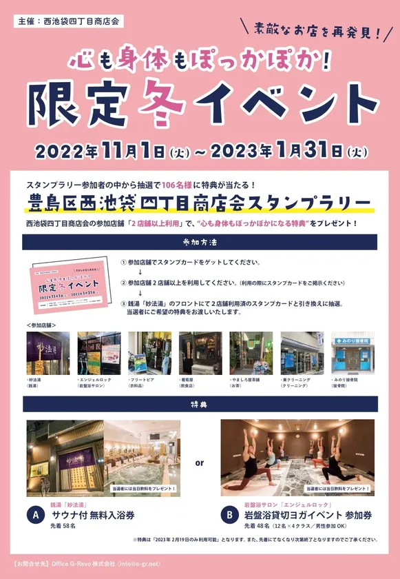 このイベントは、2022年11月1日(火)~2023年1月31日(火)までに、豊島区西池袋四丁目商店会の参加店舗(下記参照)を「2店舗以上利用」されたスタンプカードをご掲示いただき、抽選で106名様に“心も身体もぽっかぽかになる特典”を提供いたします。