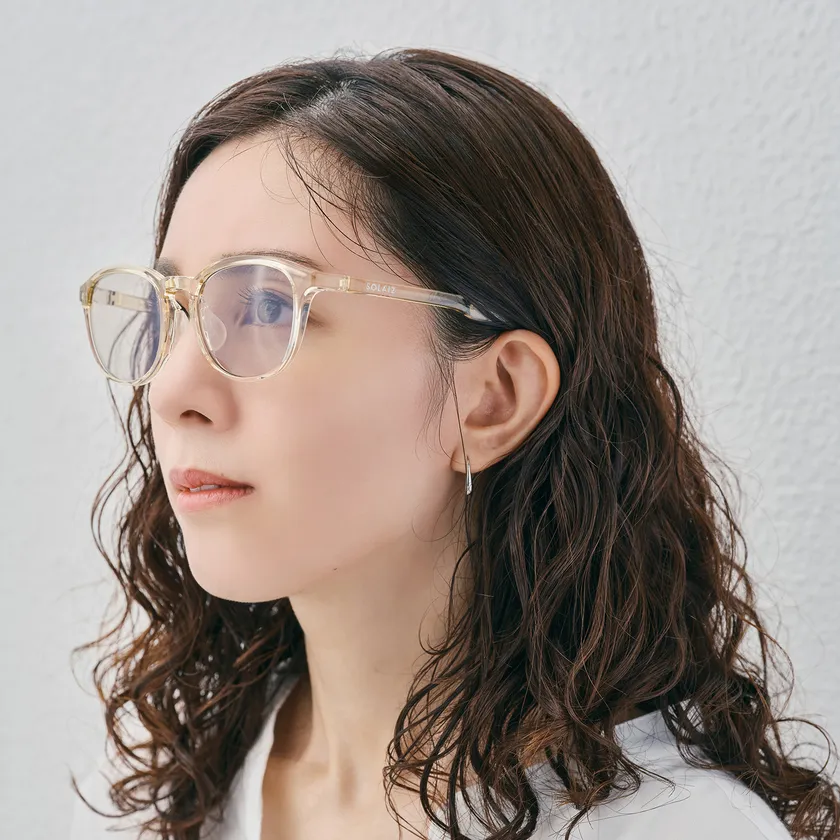 SOLAIZはフレームカラーは肌馴染みのよいクリア色をベースに、レンズカラーは瞳が見える薄いカラーをラインナップ。日常に溶け込む親しみやすいデザインで、+マスクでも抵抗感なく様々なスタイルに合わせやすいメガネです。医療分野で培った知識や技術をいかし生まれたフレーム設計で、長時間でもストレスフリーなかけ心地を実現しています。