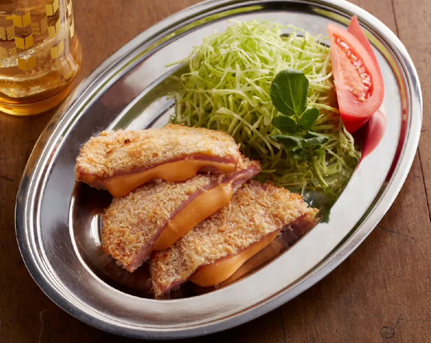懐かしい給食メニューとしてもおなじみの「ハムカツ」にMEN CHEESEをはさんで大人味に。揚げずにオーブンで焼けばヘルシーに味わえます。