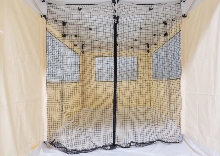 換気・自然採光機能をそなえたネット窓・メッシュ天幕(スプリンクラー対応有)