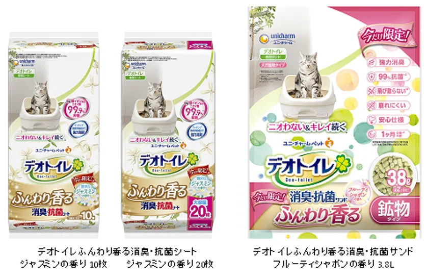 ユニ・チャーム株式会社(代表取締役 社長執行役員:高原豪久)は、猫用システムトイレに対する「香り」や「消臭」といったお客様のご要望にお応えして、『デオトイレ』取り替えシートから“ジャスミンの香り”、取り替えサンドから“フルーティシャボンの香り”を、2022年10月17日に全国で冬季限定品として発売します。