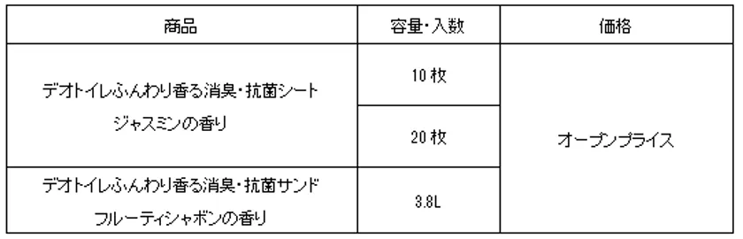 そこでこのたび、『デオトイレ』取り替えシートから“ジャスミンの香り”、取り替えサンドから“フルーティシャボンの香り”を、冬季限定品として全国で発売します。