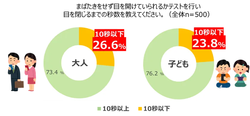 このテストでは、まばたきをせず目を開けていられる秒数を計測し、10秒以下で目を閉じた人はドライアイの可能性が高く、角膜に傷がつくリスクも高くなります。結果は、大人も子どもも約4人に1人は目が乾きやすく、どちらの世代でも角膜に傷がつくリスクが高いことが分かりました。
