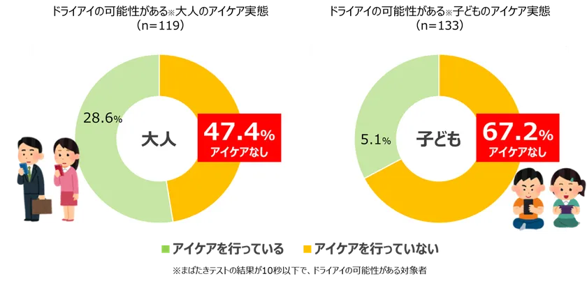 さらに、本来積極的にケアを行うべき、角膜の傷リスクを抱えている人でみてみると、大人は47.4%、子どもは67.2%がケアを行っていないということが分かりました。大人も子どもも、角膜の傷リスクを抱えているにもかかわらずケアが十分にできていない方が多くいると推察されます。