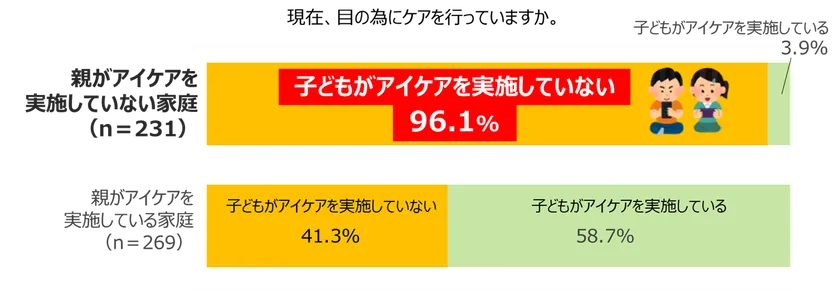 調査によると、親がアイケアを行っていない場合、その子どものほとんどがアイケアを行っていないということが分かりました。こうした相関関係から、親が積極的にアイケアを行うことで、子どもも含めアイケアリテラシーの向上に繋がると思われます。