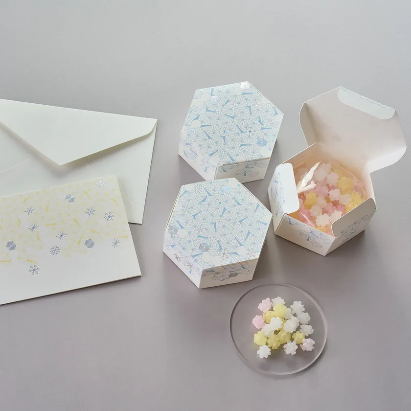 今年初めての提案、プチギフトやお年賀に使えるパッケージも、カードとお揃いで作成可能。店頭やイベントでの限定配布など、季節の販促を印象的に演出できる。既存のお客様からニーズが高いパッケージ箱を挨拶状と合わせた。
