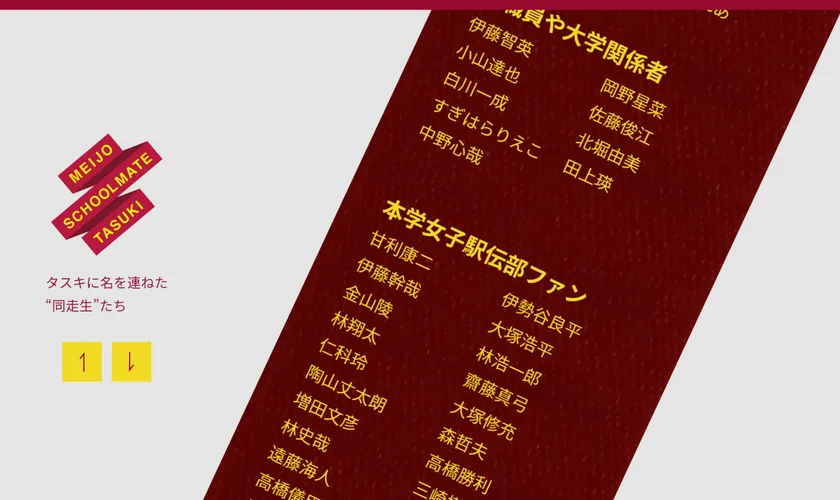 名前に込めた想いや絆を連ねた1本のタスキを選手たちに託して“同走生”の大きな輪で、選手たちを後押ししてください。応募は「MEIJO SCHOOLMATE TASUKI」サイト上のフォームから簡単に完了します。ひとりでも多くの“同走生”の参加をお待ちしています。