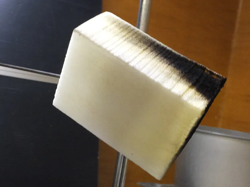 左の無塗布の発泡ウレタン(従来品)は、ろうそくの火が近づいた瞬間に、全体に火が燃え広がり、大きな炎をあげ、約50秒ほどで実験台に落下。その後、縦に大きな炎をあげて燃え続けながら、約2分30秒で完全燃焼しました。一方、右の処理液を塗布した試験体は、炎をあげて燃えることなく、煙や有害なガスも出ていません。ろうそくのススにより黒くなっている部分が広がるのみで、着火せず、実験終了の約2分30秒を経過しても、炎をあげて燃えることはありませんでした。また、表面を不燃化したことで、その風合いや見た目、断熱性能に変わりはありません。