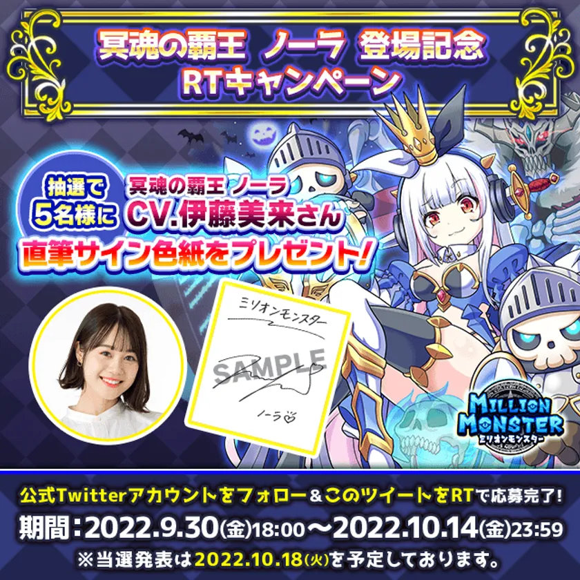 株式会社EX(所在地:東京都渋谷区、代表取締役:小野順季)は、iOS/Android端末用スマホRPG「ミリオンモンスター」の新キャラクター「冥魂の覇王 ノーラ」リリースに伴い、声優を務める「伊藤美来」さんの直筆サイン色紙が当たるプレゼントキャンペーンを2022年9月30日(金)18:00より開催いたします。