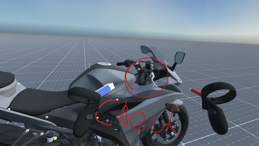 右コントローラのトリガーボタンでペンが表示されVR空間にフリーハンドで注釈を描けます。左コントローラのトリガーボタンで消しゴムが表示され描いた注釈を消去できます。