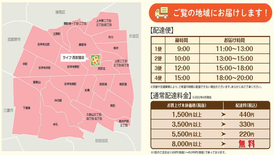 “おいしい” “ワクワク” “ハッピー” をお届けするライフコーポレーションは、9月28日(水)より東京都杉並区の「ライフ西荻窪店」で「ライフネットスーパー」のサービスを開始いたしました。
