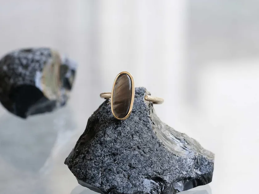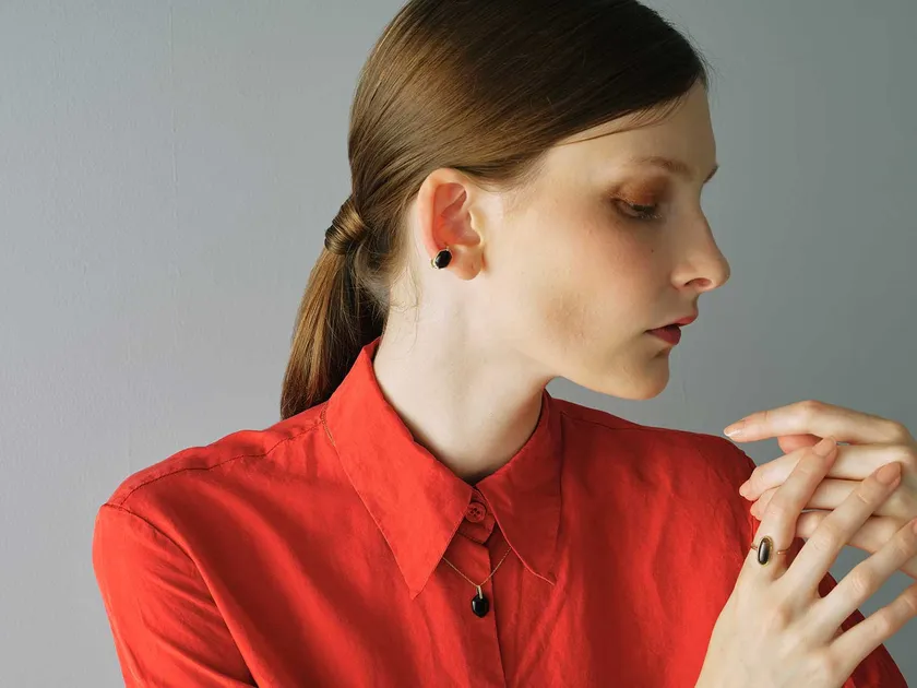 神津島より産出されるオブシディアンの中でも最も純度が高いとされるものは、神津島の西南西に位置する恩馳島の海底に眠っています。海中深くから引き揚げられた原石を研磨し、漆黒の色味と豊かなテリが美しい陰影を描くジュエリーへと仕立てました。
