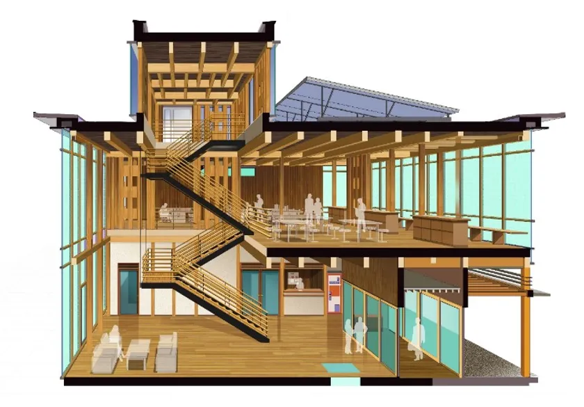 宮城県初となるCLT材を活用した『ZEB』の実現を目指した建物です。CLT材は床・屋根に使用し、柱・梁材には地元宮城県石巻の県産材を使用します。