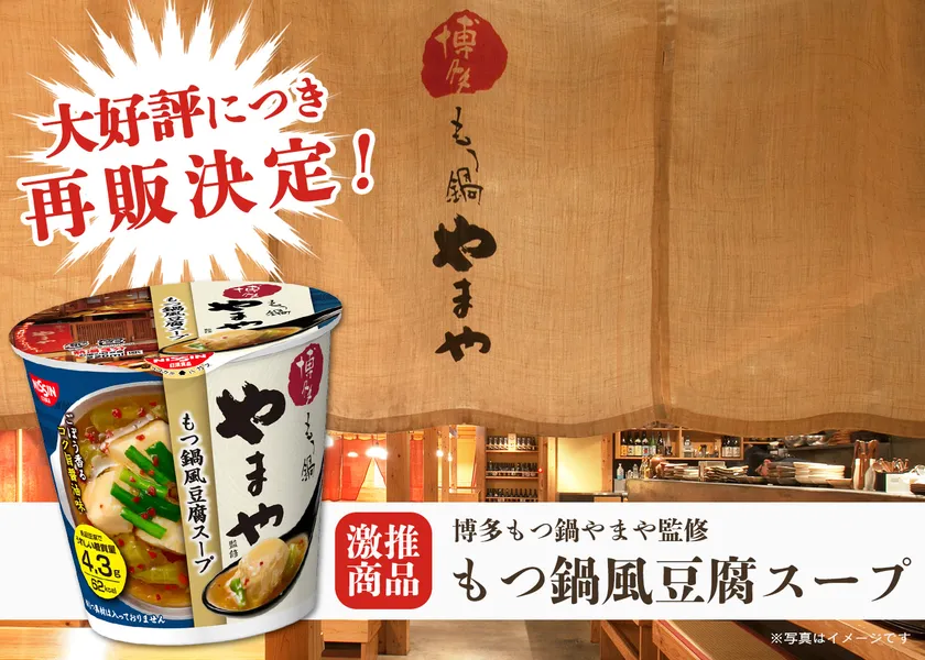 なめらかでとろける食感が特長の豆腐を使用した日清食品のカップスープと「博多もつ鍋やまや」のコラボ商品で、2022年1月に販売し、大好評をいただいた商品の再販となります。