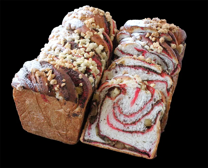 アップルティ入りアーモンドクリーム、ワインシロップ漬けのりんご、ラズベリー生地を巻き込んで焼き上げたバブカです。