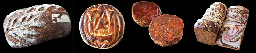 アップルティ・フェアのパン:左からアップルティ・カンパーニュ、ハロウィン・アップルパイ、クイニ―・アマン(アップルティ)、バブカ・アップルティ