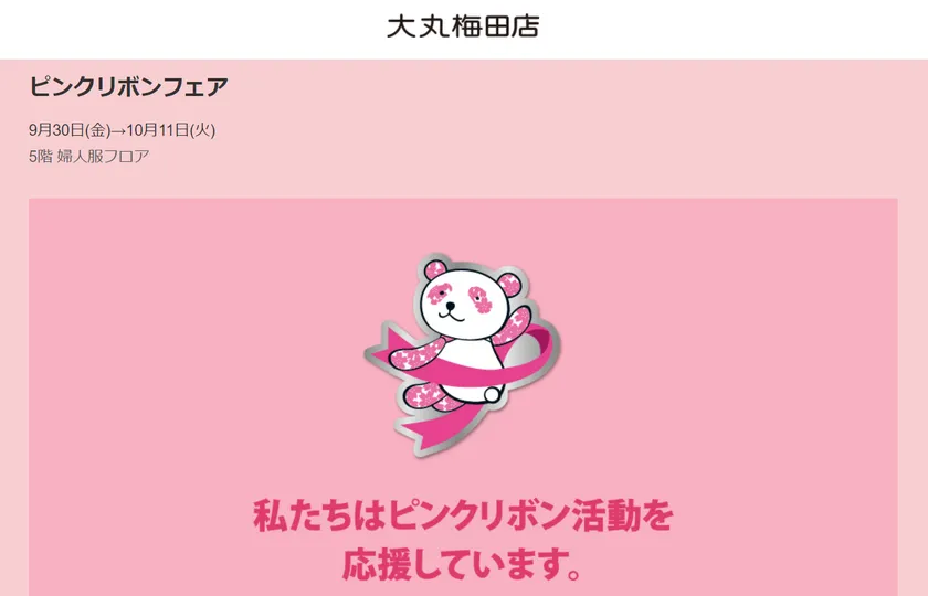 大丸梅田店 5階フロアでは、乳がんに関する知識や選択肢について、触れていただく機会としてピンクリボンフェアと題し、9月30日(金)~10月11日(火)まで開催いたします。