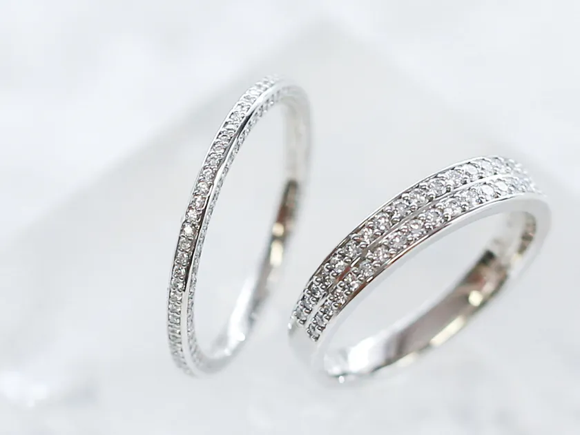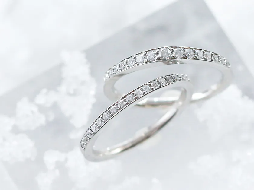 ダイヤモンドの両サイドに沿って、滑らかな地金ラインが光るハーフエタニティ2種。平らな面と角が甘さを抑えた、飽きのこないクラシカルモダンなデザインです。強度があり引っかかりを防ぐ作りになっており、日々安心してお使いいただけます。