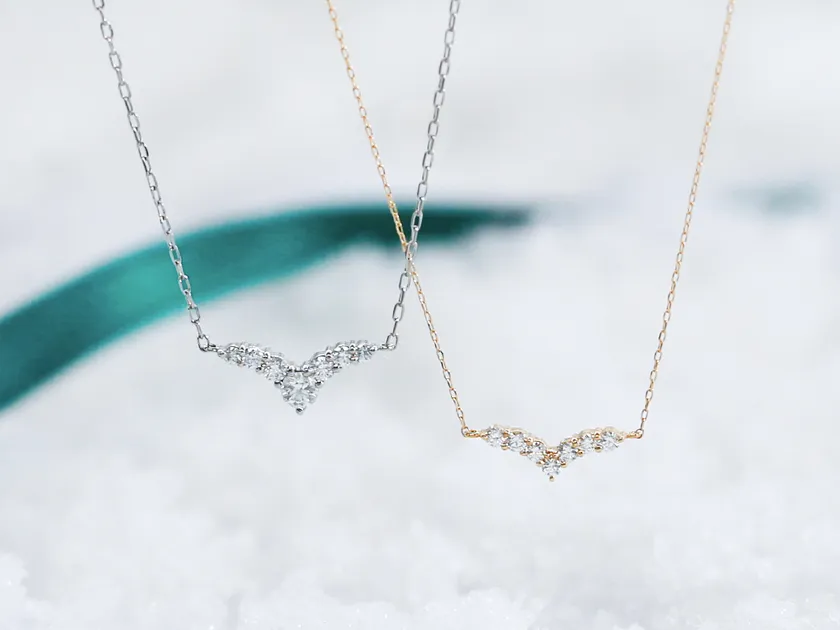 ダイヤモンドが美しい曲線を描く、さりげなくフェミニンなV字ネックレス。