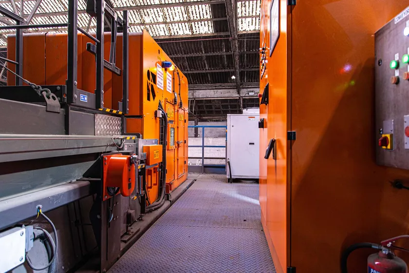 アルトレード社のオールドベリーリサイクル工場に到着した原料は、ハンマーミルでさらに細かくする前に、あらかじめ1~2メートル程度の長さに細断されます。その後、磁石と渦電流セパレータで鉄と非鉄に分離し、次の選別工程に向けて異物を除去します。