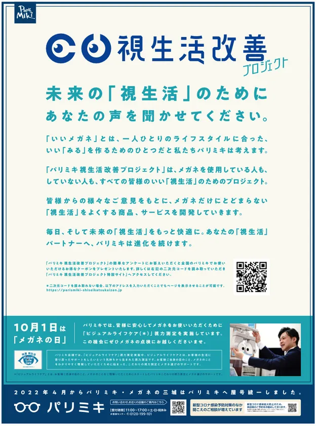 すべての皆様のいい「視生活」を作るためのプロジェクト。 「パリミキ視生活改善プロジェクト」 10月1日メガネの日より始動します
