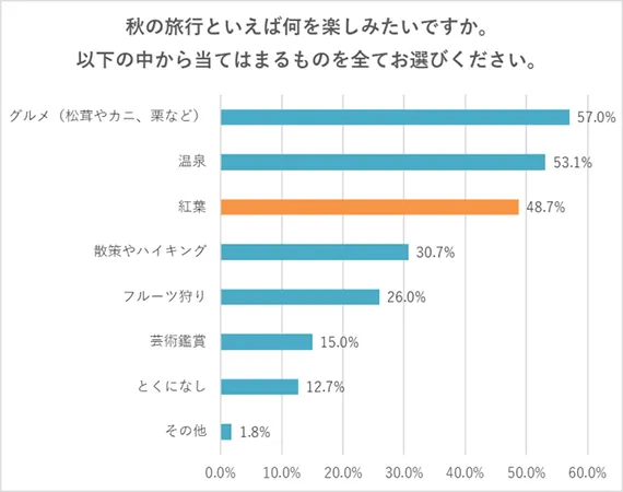 1位は「グルメ(松茸やカニ、栗など)」で57.0%、2位は「温泉」で53.1%と、季節を問わず人気なものが続き、3位に「紅葉」が入りました。48.7%の人が、秋の旅行として紅葉を楽しみたいという結果となっています。