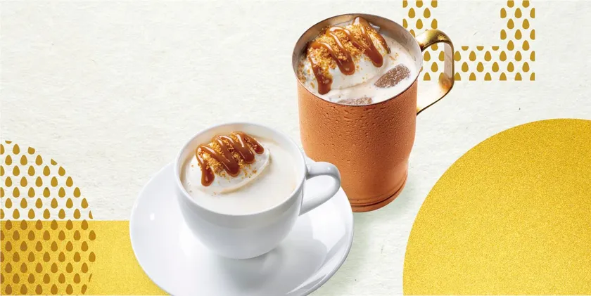 秋の人気シーズンドリンク2種が期間限定で復活! 香ばしく豊かな金胡麻の香りと風味が特長の『金胡麻ミルク珈琲』と ホッとやすらぐ林檎のような香りの『カモミールミルク紅茶』が 10月4日(火)に発売