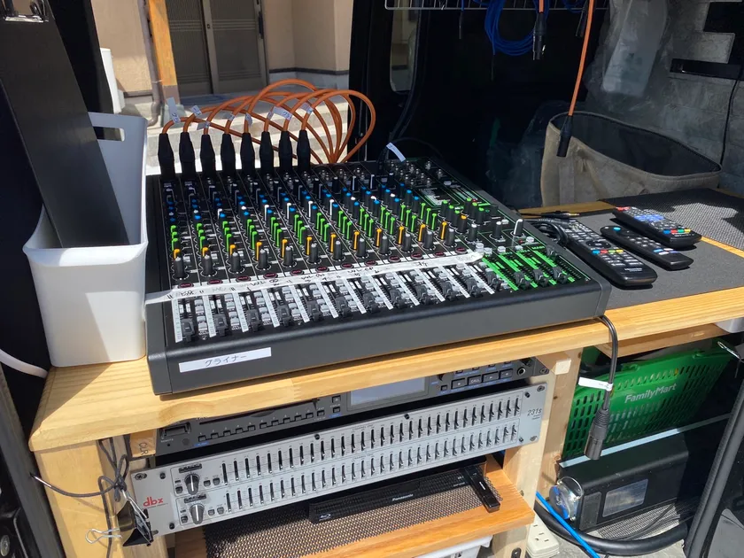 これ一台にすべて搭載しているため、ご依頼いただければ、事前に打ち合わせをさせていただき、現場についてスピーカーやケーブルなどを設置するだけで、すぐにリハーサルを行うことが可能です。