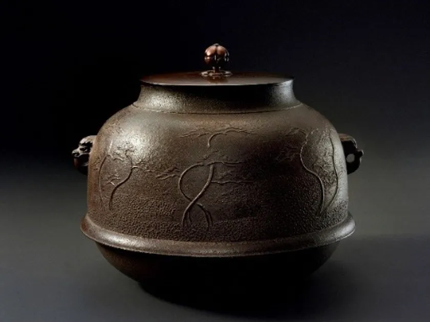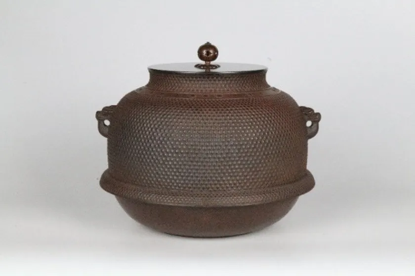 芦屋釜とは、南北朝時代頃(14世紀半ば頃)から筑前国芦屋津(ちくぜんのくにあしやつ)(現在の福岡県遠賀郡芦屋町)で造られた鉄製の茶の湯釜です。「真形(しんなり)」とよばれる端正な形と、胴部に表される優美な文様が特徴です。