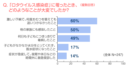 ロタウイルスに感染をすると、下痢や嘔吐の始末を含め、子どもの看病の大変さや憔悴する子どもがかわいそうで見ていられないといった声が多く挙げられました。